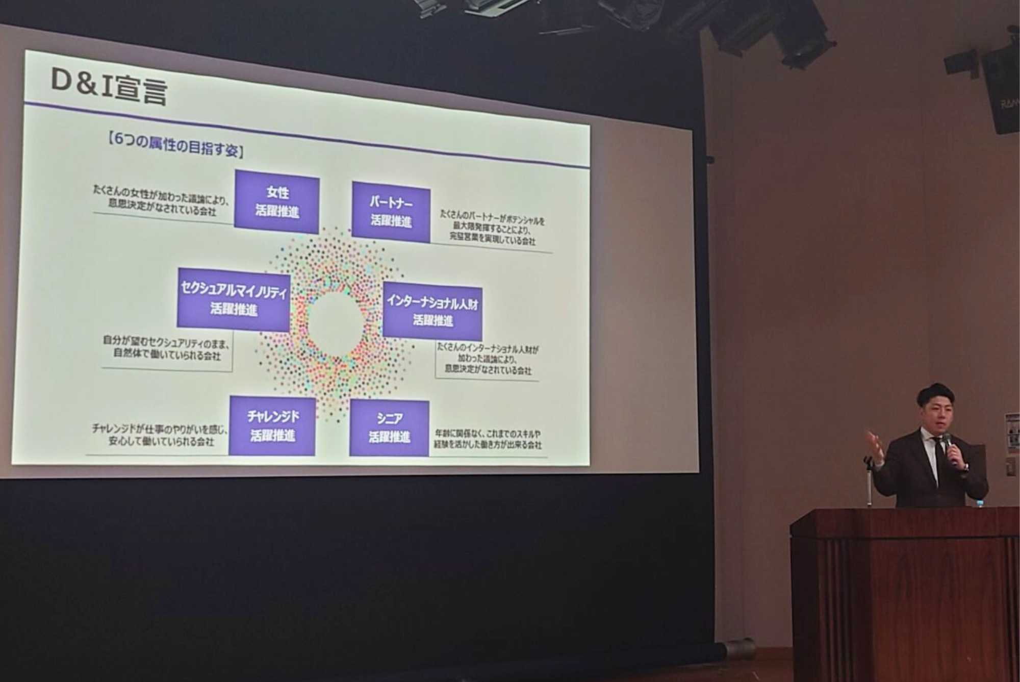 本講演は、女性従業員をはじめとする従業員一人ひとりの「“個”のチカラの活性化」が生む「本質的な競争力」をテーマに、当社が取り組むダイバーシティ&インクルージョンや「女性活躍推進プロジェクト」について、加藤が約60分にわたり具体的な事例を交えたプレゼンテーションを行いました。