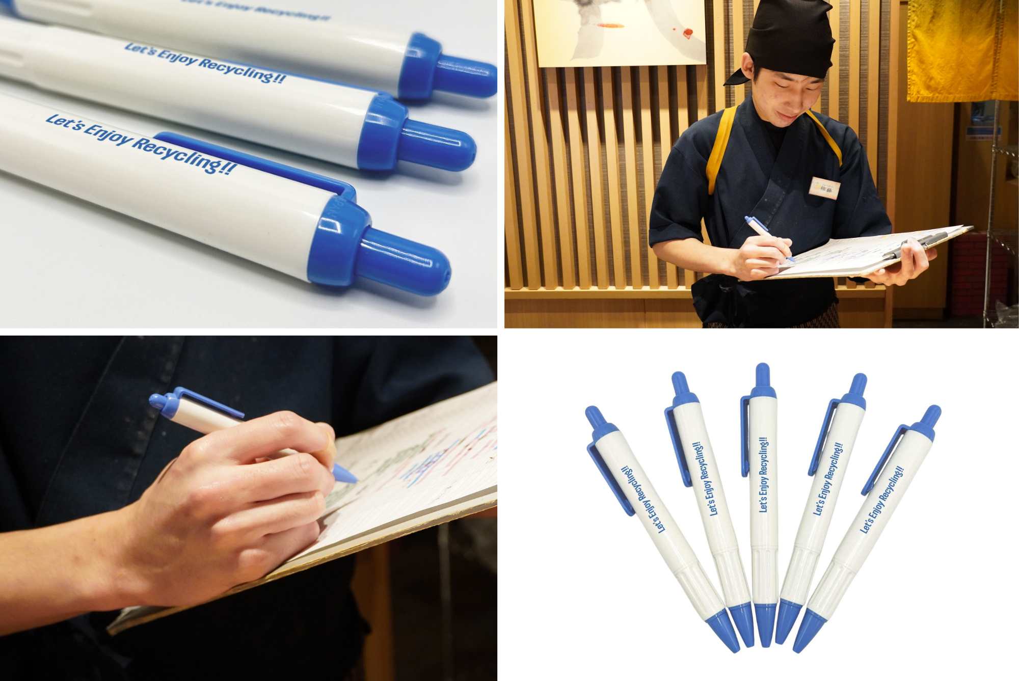 このたび、回収したグラスから生成したペレットを使用し、新たに「リサイクルボールペン」を製作いたしました。初回製作量はボールペン本体3万本で、全国の『焼肉きんぐ』『丸源ラーメン』『寿司・しゃぶしゃぶ ゆず庵』『お好み焼本舗』等の直営全店舗およびオフィスにて本日より従業員が順次使用いたします。ボールペン本体には「Let’s Enjoy Recycling!!」(リサイクルを楽しもう)のメッセージを印字することで、使用する従業員に対する環境問題意識の向上を図ります。また、耐衝撃性に優れている成分「ブタジエン」を本体の素材に重合し、リサイクル率を35%とすることで、食品を扱う店舗における利用に適した折れにくく割れにくいボールペンが実現いたしました。さらに、ボールペンの替え芯2,000本※2を併せて製造することで、ボールペン本体の廃棄量削減の効果を見込んでおります。